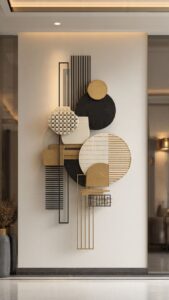 Metal modern wall decor items art has been growing steadily in popularity and 2026 is its peak moment in Indian home decor. Geometric designs—hexagons, abstract line art, sunbursts, or interlocking shapes—in black, gold, copper, or rose gold finish add a contemporary, sophisticated look to any wall.