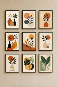 • Minimalist abstract shapes in terracotta, sage green, or warm neutrals