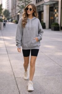 Product recommendation: Hoodies from streetwear brands or even men’s sections give that perfectly oversized fit. Bike shorts from athletic brands offer the best quality and comfort.