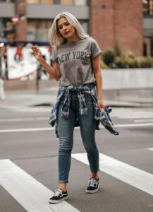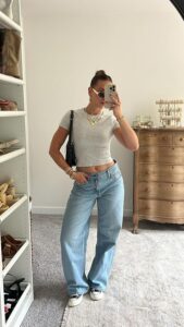 Product recommendation: Brands like Brandy Melville, Urban Outfitters, and even Amazon have tons of baby tee options. For jeans, check Levi’s, American Eagle, or Zara.