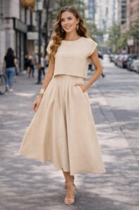 Fabric combinations: A satin crop top with a crepe skirt creates interesting texture contrast. A fitted ribbed top with a flowy midi skirt balances proportions. Both combinations work beautifully.