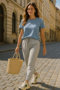 Joggers aren’t just for the gym anymore. Paired with a simple tee and sneakers, they create one of the best airport outfits for women on budget.